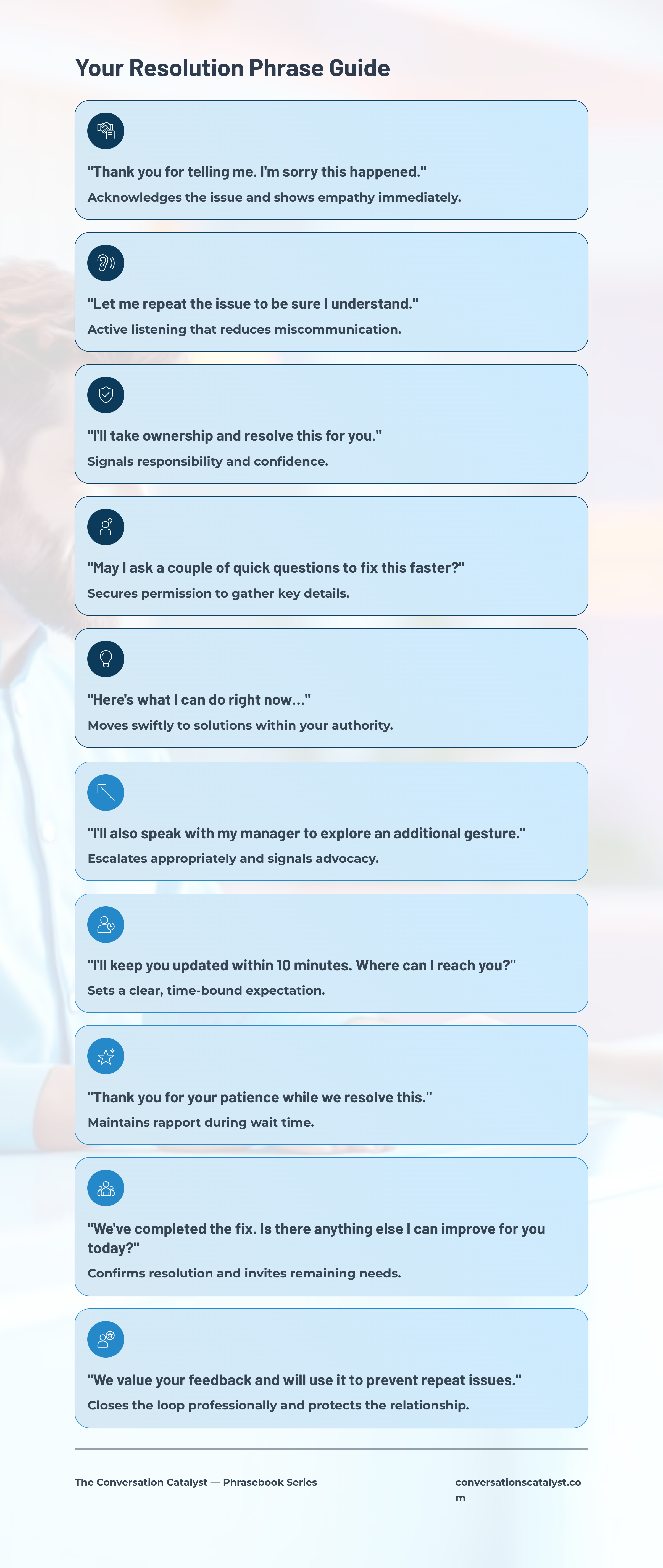 Use these proven service-recovery phrases to acknowledge issues, clarify needs, and resolve guest complaints quickly. Free one-page PDF.